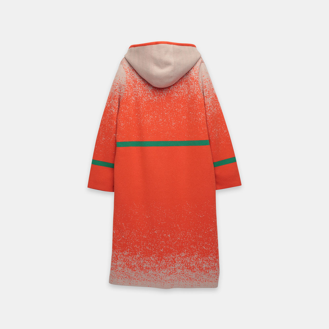 ニットのグラデーションジャガードにトレンドのTHINDOWN (シンダウン)を入れたフード付きコート。ニットは防寒にならないという概念を超えたエクスクルーシブなニットコート。