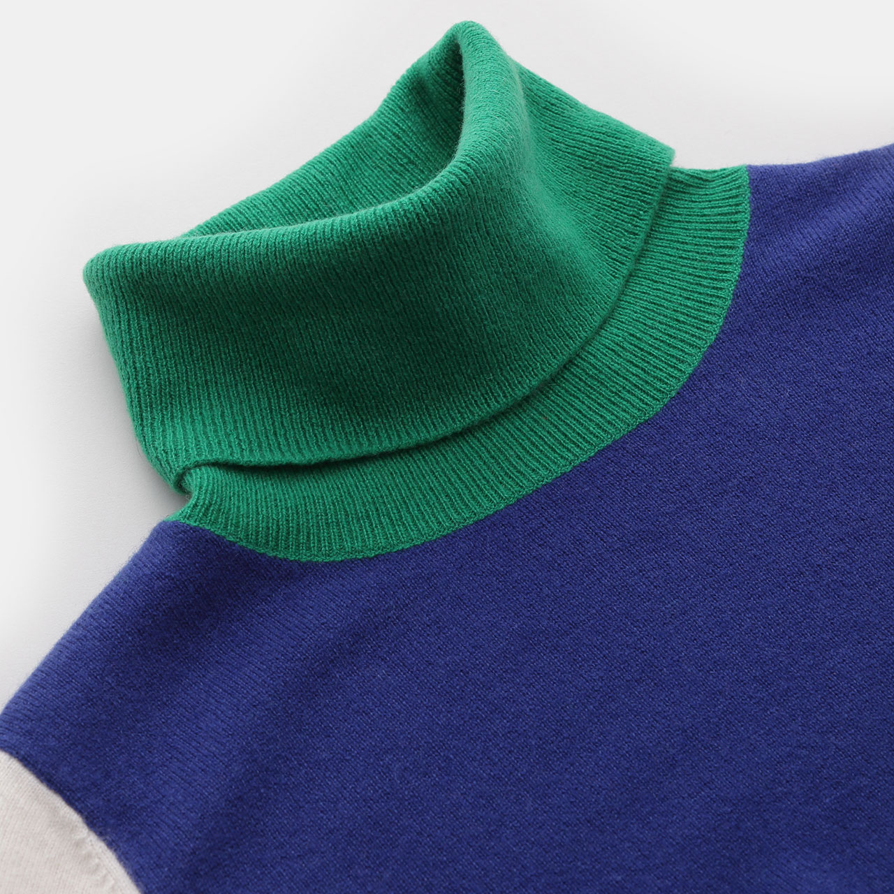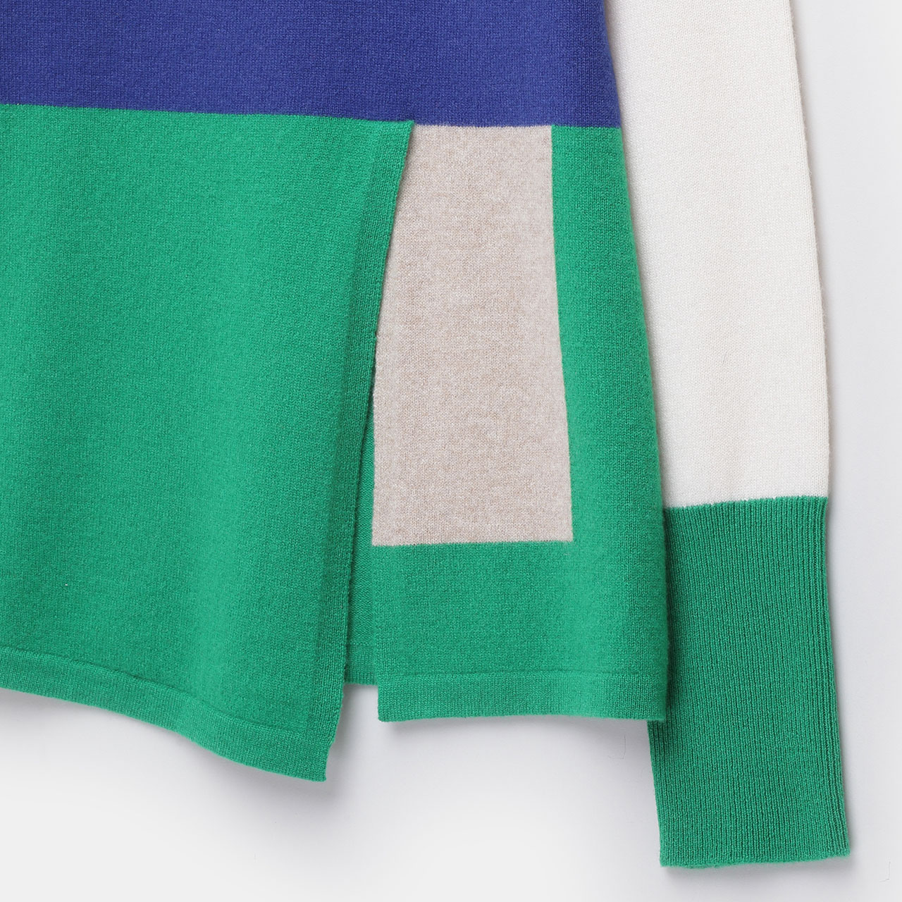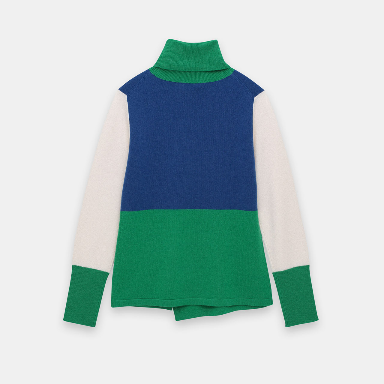 ブロッキングがお酒落なタートルネックプルオーバー。配色の楽しさと裾のスリットがポイント。